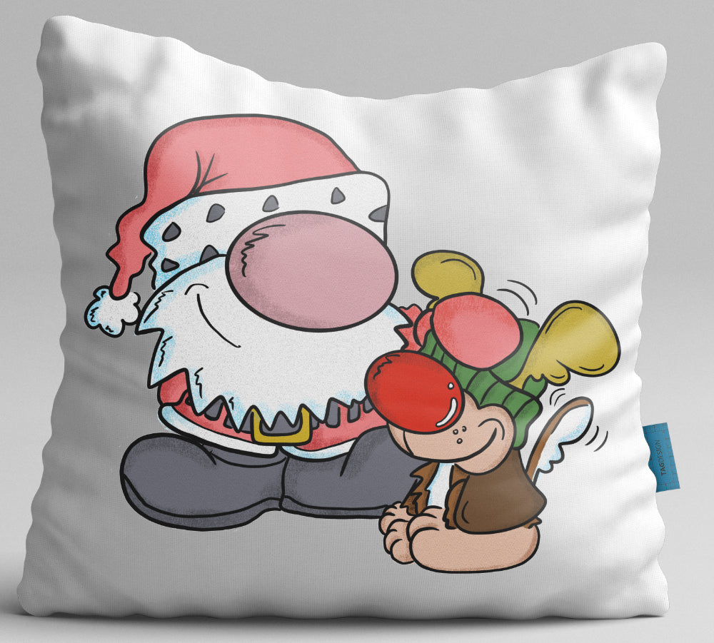 Ho Ho Ho ! Add a festive touch to your Christmas Decorating this holiday season. The delightful holiday throw pillow is printed on both sides and features a cartoon Santa and his playful reindeer puppy. It's ideal for those who love to decorate for Christmas or simply want to spread cheer. It’s perfect for celebrations, holiday gatherings, or just curling up on the couch with a hot cocoa. Elevate your home with this piece of fun Christmas decor. It's a joyful accessory that helps make everything merry and bright !